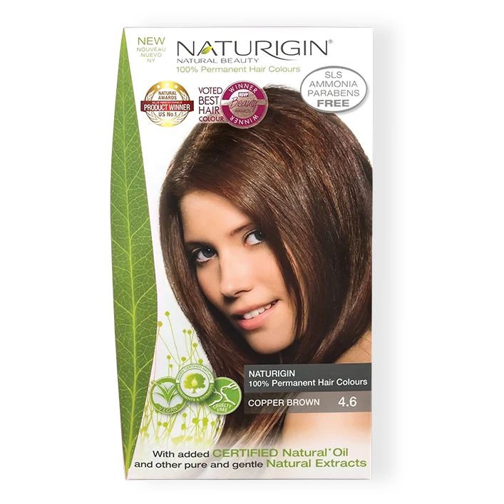 Tintura permanente vegana Copper Brown 4.6 de Naturigin nutre el cabello con aceite de argán, aloe vera, aceite de jojoba y manteca de karité, cubre las canas y mantiene el color hasta 25 lavados