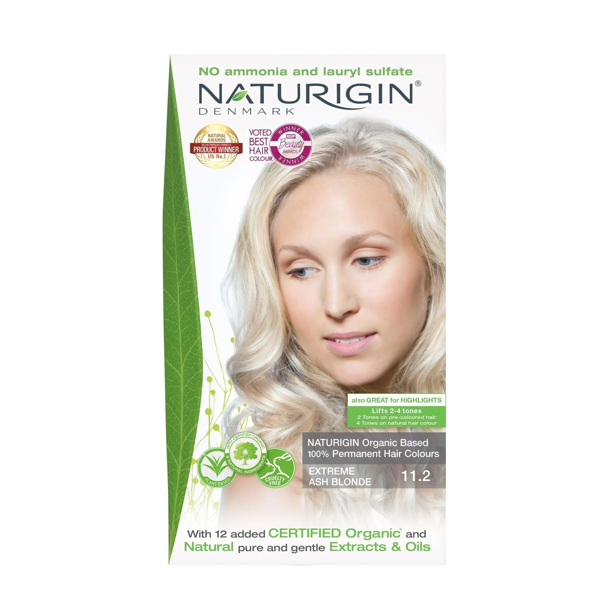 Tintura permanente vegana Extreme Ash Blonde 11.2 de Naturigin cubre canas al 100 %, aporta un rubio ceniza ultra claro con matices fríos y nutre la fibra capilar con aceite de argán, aloe vera, aceite de jojoba y manteca de karité.